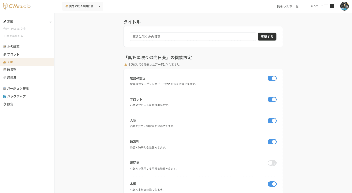 執筆した文章はもちろん、物語の設定やプロットもテキストデータでバックアップを取ることが可能です。